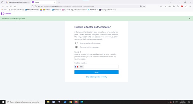 - Si vous avez déjà un compte KNOWA: Allez dans Knowa; ensuite, allez dans « settings », en cliquant sur votre nom en bas à gauche; ensuite, en descendant la page, vous trouvez un bouton vert « Turn on extra security », cliquez dessus.